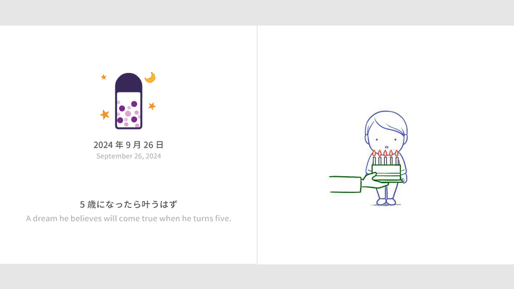 それでも何かを作りたいという衝動だけが心の中を走り抜ける中、やはりそれは、自分が一番大切にしてきた表現であるアニメーションに違いないという確信だけは抱いていました。かつて、「#あちこちのすずさん」という番組で、『"満州"を生き抜いた少年』というエピソードを担当し、アニメーションを制作したことがありました。その時、アニメーションは過去の記憶を現代に蘇らせ、再生させることができるのだと知りました。 では、私がアニメーションに乗せたい記憶とは? と思った時、やはり目の前にいたのは2人の息子達でした。彼らは本当に毎日おもしろいことをしでかしてくれます。彼らが産まれてから、私の日常はほぼ彼らのために費やされるようになりました。そして、他のことを考える余裕はほとんどなくなっていました。彼らによって追い詰められる日々は、同時に彼らと私の大切な記憶ともなる、この相反する2つの感情が、私の中に常に存在するようになっていました。 「今だけよ」「今のうちよ」、これは声援だったのだと、制作を始めた今ではわかります。でも、当時の私にとっては呪いでもありました。 鑑賞者の方々からは、「わかります」「共感しかありません」という声とともに「どうして忘れちゃってたんだろう…」「ようやくこういうことを描いてくれる作品と出会えた」という、孤独な日々にようやく自ら労いをかけることを許せたような言葉をいただくこともあります。 『記憶の図書館』はこれからもエピソードが増えていきます。 アニメーションによって描かれたこども達は、役者が演じるのとは違い、そこに実像は存在しません。つまり、彼らは彼らでありつつ、同時に「だれかのだれか」にもなりえます。 私の記憶が、だれかの記憶の引き出しの鍵となりますように。 |